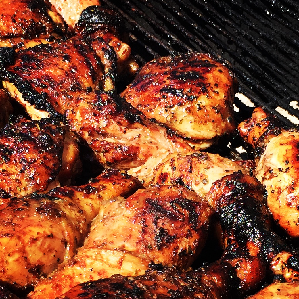 Once the 30 minutes has past, and if your coals are grey, remove the chicken from the marinade and place it directly over the coals and put the lid on with about 20% air flow. If you don’t know your grill that well, check on the chicken after a minute or so to make sure you are making jerk, not jerky. The sugar content of the marinade will lead to some desirable charring. Once you have good color (brown, to dark brown) or have cooked the chicken with direct heat for 20 minutes, move the chicken to the indirect side of the grill and cover. Cook the chicken indirectly for at least 35 minutes, 45 being ideal, turning over once and basting occasionally with the remaining marinade. For the best results, have minimal airflow for this period of grilling as we will draw on the low and slow philosophy to finish the chicken.